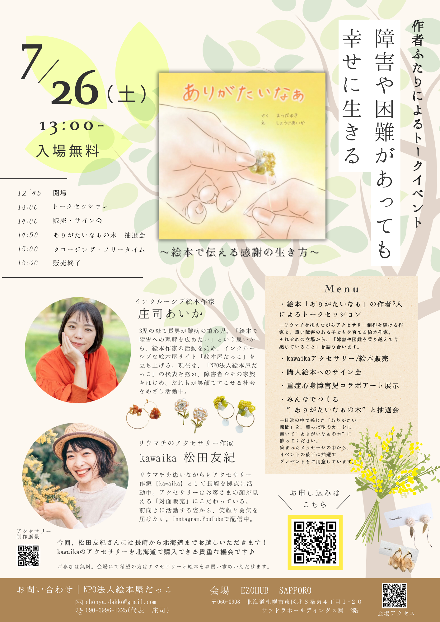 長崎から共同作者でリウマチのアクセサリー作家である松田友紀さんをお招きし、エゾハブサッポロの素敵な空間で「障害や困難があっても幸せに生きるには」というテーマでトークセッションをさせていただきました。